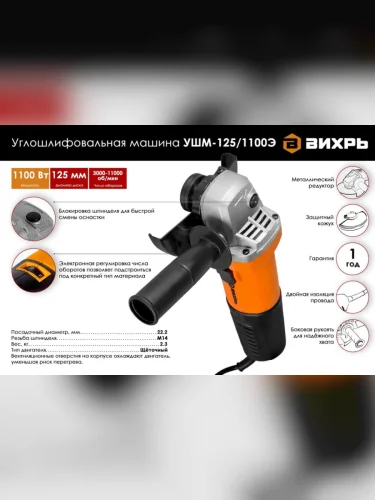 Машина углошлифовальная 1100Вт 125мм 3000-11000обмин. ВИХРЬ ВИХРЬ 721210 в Туле Тульской области
